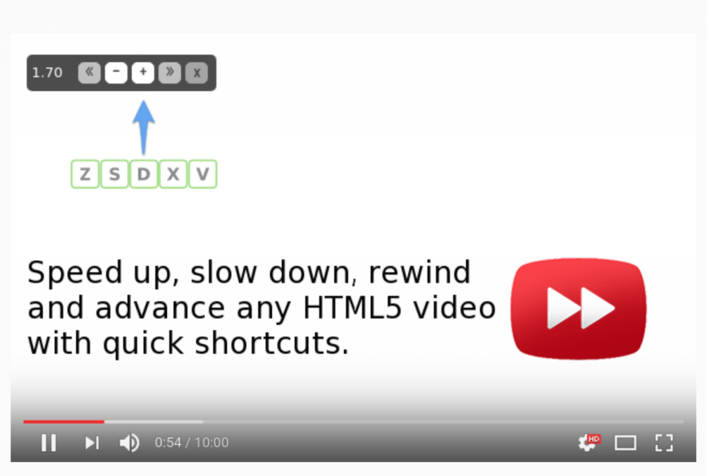 É um acelerador de vídeos que pega em qualquer vídeo de qualquer site. Assistir aulas, palestras, cursos, treinamentos  com velocidade elevada causa maior absorção do conteúdo, mais concentração, foco e atenção ao conteúdo passado. Sem falar na economia de tempo.