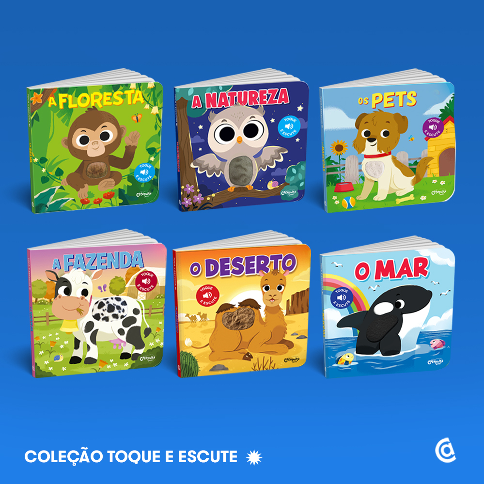Coleção Toque e Escute: O Mar, A Natureza, A Floresta, Os Pets, O Deserto, A Fazenda – Indicado para bebês, a coleção “Toque e Escute” apresenta desenhos coloridos e cheios de detalhes. Os títulos encantadores foram criados para que a criança aprenda a reconhecer diversos cenários e seres vivos se divertindo enquanto sente as texturas da pele de cada espécie presente nas páginas e ouça os sons que os animais emitem.