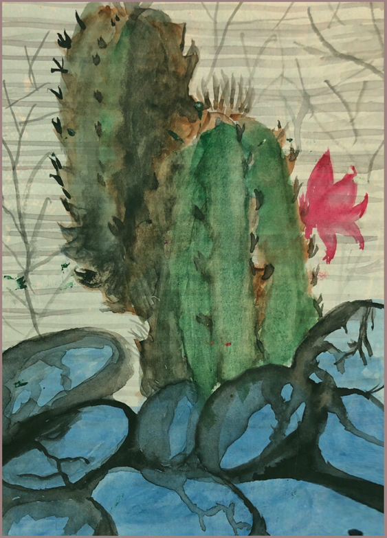 A aquarela intitulada “Resistindo à Adversidade” retrata um cacto florescido em meio ao sertão alagoano. A cor e a delicadeza da técnica de aquarela contrastam com a aridez da paisagem tipicamente nordestina.
