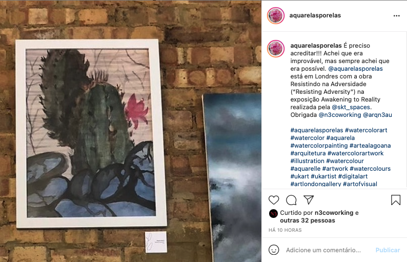 “Eles descobriram meu trabalho através do Instagram @aquarelasporelas, onde coloquei à venda as peças da mostra e várias outras pinturas. Uma pessoa de Londres entrou em contato por direct e adquiriu a minha ilustração Resistindo à Adversidade, que enviei pelo Correio. Depois descobri que eram os curadores da galeria, quando me convidaram para a mostra”, conta com entusiasmo.