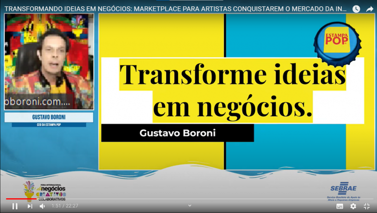 A programação de palestras online da terceira edição da Feira Internacional de Negócios Criativos e Colaborativos (FINCC), promovida em formato remoto pelo Sebrae Paraíba, teve continuidade na última quinta-feira (06). Uma delas, ‘Transformando Ideias em Negócios: Marketplace para Artistas Conquistarem o Mercado na Internet’, foi ministrada por Gustavo Boroni, alagoano, fundador do estúdio de soluções criativas Estampa Pop (@estampapop).