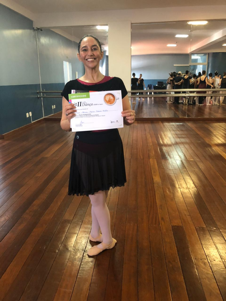 “A paixão foi tanta que eu resolvi fazer um instagram pra tratar de assuntos do ballet clássico, sobretudo da bailarina adulta, porque há uma diferença de você ter começado criança e de ter começado como eu com 42 anos. Eu comecei a correr atrás do tempo que eu não fiz, então estudar muito, assistir filmes, assistir ballet clássico, assistir repertórios, fazer cursos como a gente fez o de Joinville, como a gente fez o Café com Dança” – Luci Mônica.
