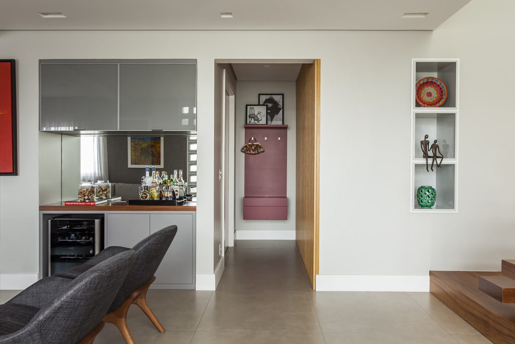 “O bar pode se adaptar a qualquer estilo decorativo, incluindo desde o clássico, com um balcão e copos pendurados, até uma visão mais contemporânea, que incorpora uma bandeja com copos e garrafas bem-dispostas, propiciando charme ao ambiente. Vale sempre a criatividade de cada morador”, comenta Karina. Sobre a localização, embora não haja uma regra, o bar é muito bem-vindo na parte social da residência, que pode ser no living, na sala de jantar ou na varanda.