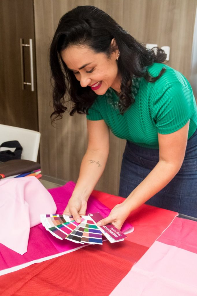 Não é só estética. As cores passam mensagens. O azul turquesa, por exemplo, transmite uma imagem de suavidade, sobriedade, descontração. Já o pink é mais energia, vibração. Vale escolher a cor que vai trazer mais autoridade e segurança, sem limitação, pois as cartelas vêm com mais de 60 cores para combiná-las entre si, seja em tecidos lisos ou estampados florais e geométricos, por exemplo.