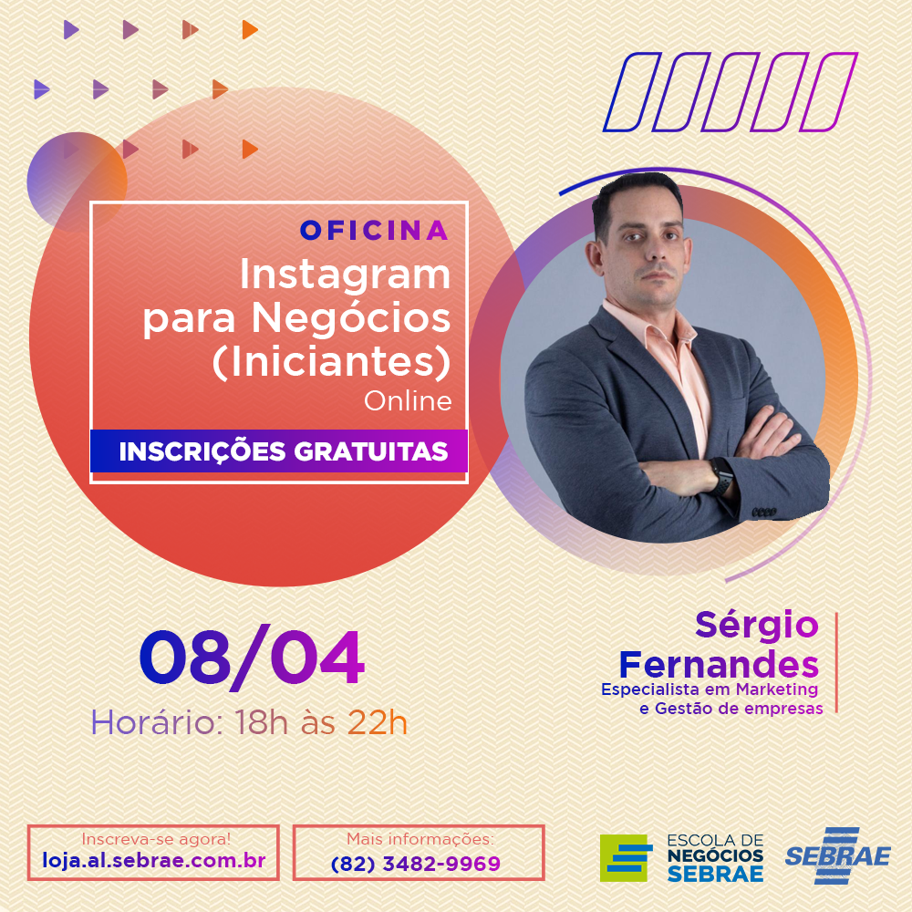 As inscrições para a ‘Oficina Instagram para Negócios – Iniciantes’ são gratuitas e podem ser feitas podem ser feitas pela Loja Virtual do Sebrae Alagoas por meio do link: https://loja.al.sebrae.com.br/loja/evento/132105828-instagram-para-negocios-iniciantes.