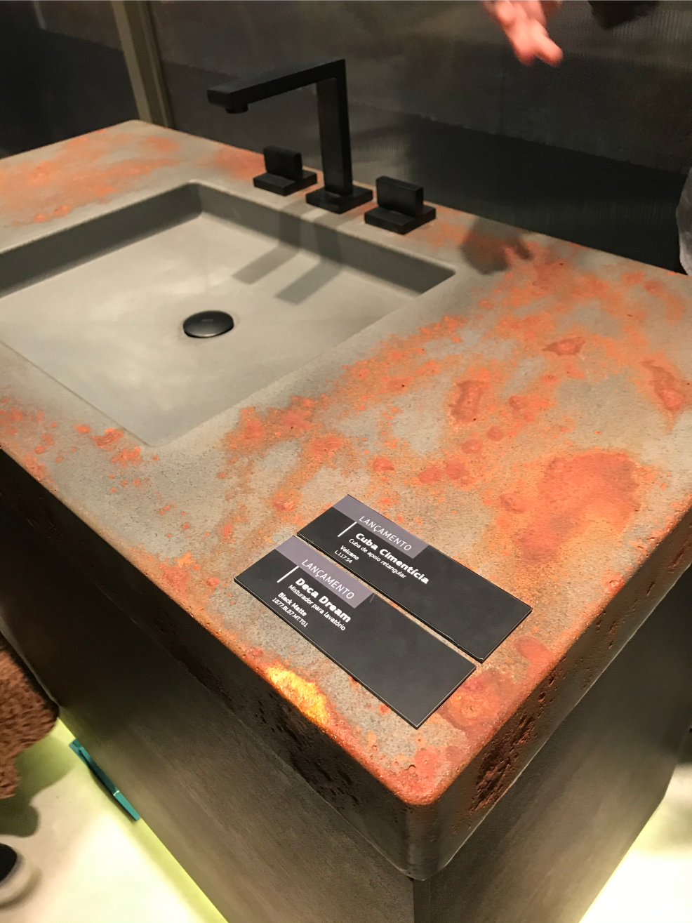 Os acabamentos com estética oxidada também foram sucesso. Presentes em revestimentos e bancadas.