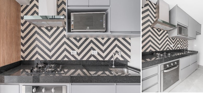 Uma alternativa para colorir a cozinha é deixar o espaço conhecido como backsplash – aquela área entre a bancada da pia do armário superior, também chamada de frontão – revestido de maneira diferenciada. O material pode ser o mesmo da pedra da bancada da cozinha, ou pequenos formatos podem ser inseridos, como ladrilhos ou tijolos, em cores diferentes. Para esse projeto foi usado a paginação Chevron com cerâmicas pretas e brancas | Foto: Kadu Lopes