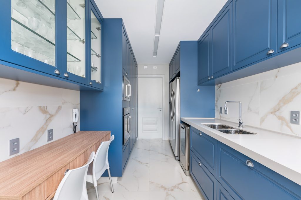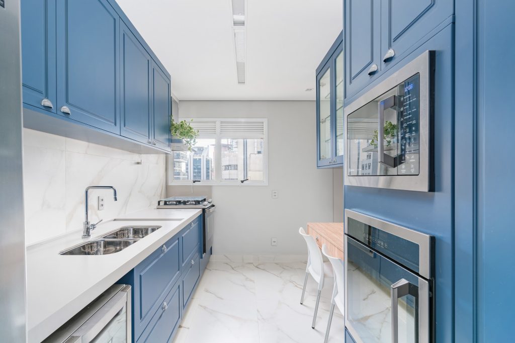 A cozinha faz parte do apartamento de uma digital influencer e personal branding e ganhou ainda mais sofisticação com o piso marmorizado. No planejamento inteligente da marcenaria azul realizado por Ana Rozenblit, todos os eletrodomésticos são acoplados com classe e elegância | Foto: Kadu Lopes