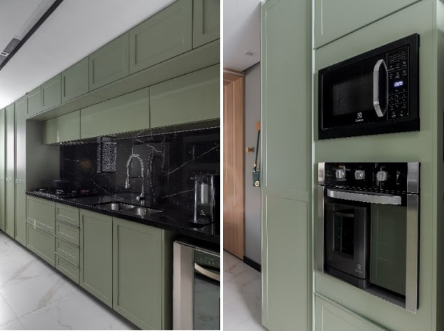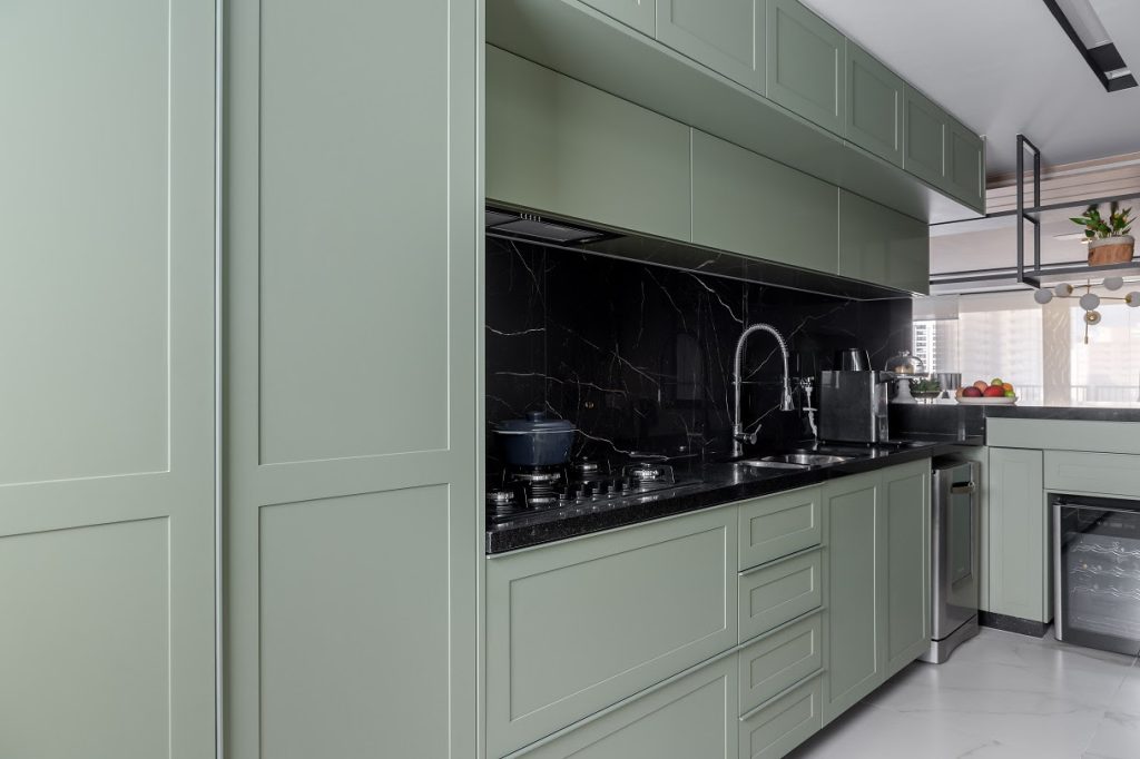 As cores revestindo as cozinhas estão de volta! Depois de décadas como tendência, o neutro reinou por anos, porém as cores estão novamente ocupando seu lugar no décor da cozinha: neste projeto de Ana Rozenblit, o verde-menta ganhou o protagonismo na marcenaria inteligente. | Foto: Rafael Renzo