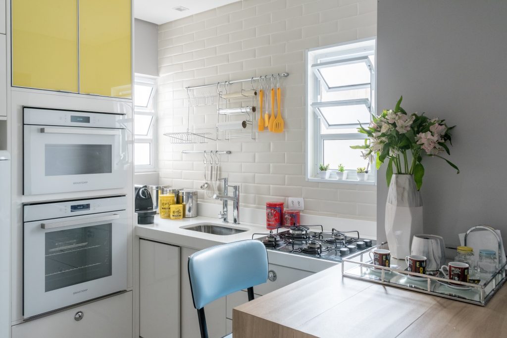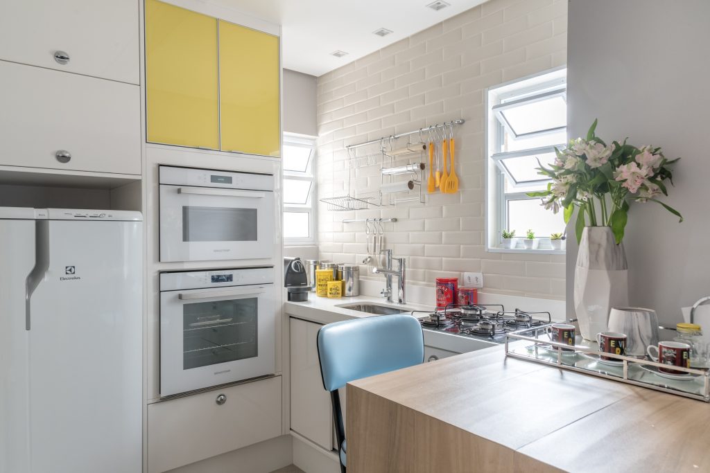 O revestimento de tijolinhos deixa a cozinha ainda mais aconchegante e com ares campestres, ideal para o imóvel que é o primeiro de uma jovem que veio do interior para a capital paulista com o propósito de trabalhar e estudar. Na cozinha planejada, foi destacada a marcenaria lateral, dando a sensação de amplitude no ambiente | Foto: Julia Herman Fotografia