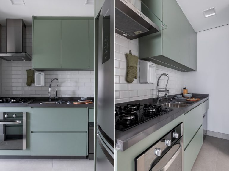 “Com o mobiliário executado num verde-oliva lindo, combinamos acabamentos fosco e brilhante com profundidades diferentes, resultando no equilíbrio e, ao mesmo tempo, um movimento interessante”, explica Ana Rozenblit sobre essa cozinha colorida, projetada em sua própria casa | Foto: Rafael Renzo
