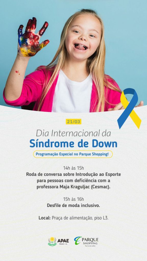 O Dia Internacional da Síndrome de Down (21/3), mais uma vez, vai ganhar atenção especial do Parque Shopping. Na próxima segunda-feira (21), uma programação em parceria com a APAE tomará conta do palco da Praça de Alimentação (piso L3) para chamar a atenção do público a respeito da inclusão social de pessoas com a síndrome. Às 14h, uma roda de conversa com a professora Maja Kraguljac (Cesmac), abordará a Introdução ao Esporte para Pessoas com Deficiência. Na sequência, às 15h, um desfile de moda inclusivo apresentará lançamentos da temporada com um casting de modelos com Síndrome de Down.
