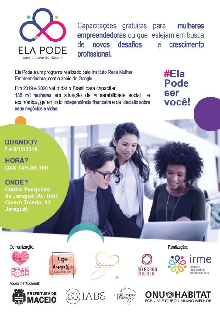 A busca por realização profissional, renda extra ou passar mais tempo com a família são algumas das causas que levam as mulheres a empreender. Mas, para ser uma líder nos negócios, elas precisam de capacitação. Pensando nisso, a Prefeitura de Maceió, o Instituto Brasileiro de Desenvolvimento e Sustentabilidade (IABS) e o Circuito Urbano 2019/ONU Habitat apoiam o programa Ela Pode, realizado pelo Instituto Rede Mulher Empreendedora com o apoio do Google, que realizará uma capacitação gratuita nos dias 7 e 8 de outubro (segunda e terça), das 14h às 18h, no Centro Pesqueiro de Jaraguá, localizada à Av. Indl. Cícero Toledo, 31, Jaraguá, em Maceió.
