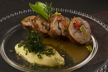 Prato: Costelinha Enrolada – Filé de costelinha assada lentamente para ser grelhada e servida com purê de batata com mostarda em folha no azeite e farofa de pimenta de cheiro