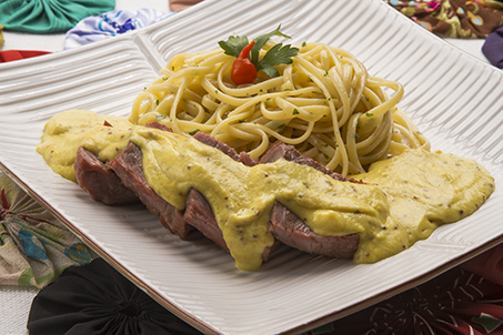 Prato: Escalopes de sol ao molho mostarda – carne de sol de contra filé ao molho de mostarda francesa com linguini na manteiga