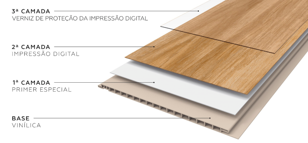 Tudo isso é possível com o TETO VINÍLICO, um produto composto por base vinílica mais três camadas aditivas: primer especial, impressão digital e verniz de proteção. É sustentável, resistente à umidade, fungos, propagação de fogo e tem durabilidade superior a 15 anos. Pode ser utilizado em varandas cobertas, áreas internas sociais, íntimas e inclusive molhadas como banheiros e cozinhas.