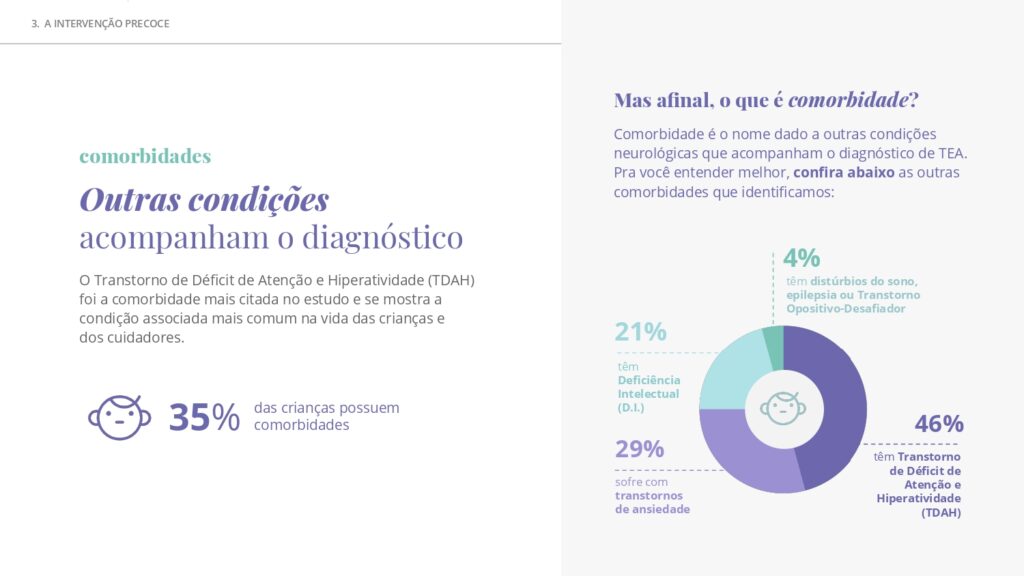 Comorbidade é o nome dado a outras condições neurológicas que acompanham o diagnóstico de TEA, o Transtorno de Déficit de Atenção e Hiperatividade (TDAH), com 46% das respostas, foi a comorbidade mais citada no estudo e se mostra a condição associada mais comum na vida das crianças e dos cuidadores.