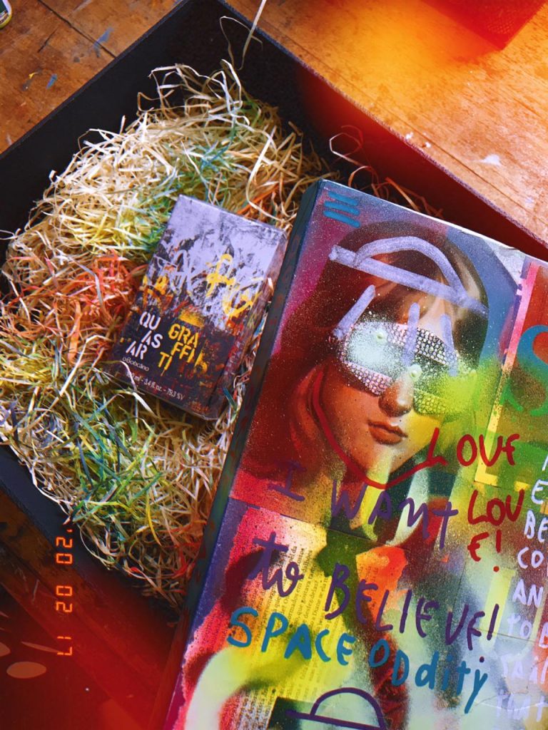As caixas utilizadas na montagem dos press kits foram projetadas para uma ação anterior da marca e reaproveitadas em Quasar Graffiti. Com tintas, papeis, stencil e, claro, muito spray, Diego transformou tampas de MDF em quadros exclusivos.