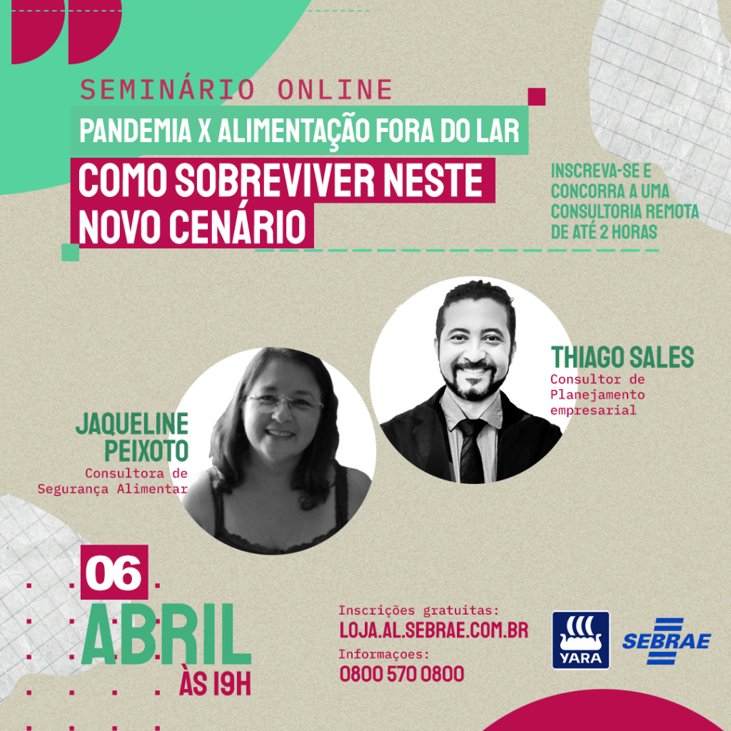 As inscrições para o seminário ‘Pandemia x Alimentação Fora Do Lar: Como Sobreviver Nesse Novo Cenário’ são gratuitas e podem ser feitas pela Loja Virtual do Sebrae Alagoas por meio do link: https://loja.al.sebrae.com.br/loja/evento/132111763-seminario-pandemia-x-alimentacao-fora-do-lar-como-sobreviver-nesse-novo-cenario. Os inscritos irão concorrer a uma consultoria remota de até 2h. O evento é promovido em parceria com a Yara Brasil.