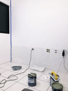 Porém eu não queria fazer obras nesse momento e comecei a pesquisar alternativas para fazer a minha parede de tijolos. A forma mais fácil de conseguir o efeito é usando papel de parede, tem várias opções no mercado. Mas eu queria uma alternativa que desse efeito mais próximo ao do tijolo real.