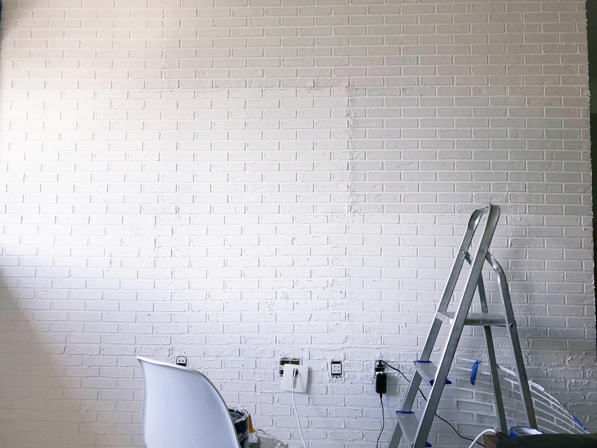 Depois de concluir toda a parede, esperei que a massa secasse completamente, lixei para dar acabamento e apliquei tinta acrílica fosca para interior. Eu usei a cor branca porque prefiro uma decoração mais minimalista e um ambiente mais claro.