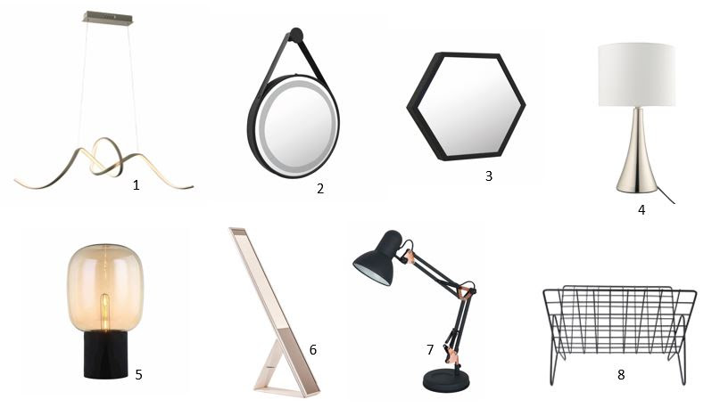 1. Pendente escultural de metal com led integrado, na cor dourada (36W e 3000K), por R$ 1.146 | 2. Espelho redondo Ø60cm, em alumínio preto com led integrado (72W e 2700K a 4000K), por R$ 1.613 | 3. Espelho decorativo hexagonal, de alumínio preto, com 35 cm (diâmetro), por R$ 328 | 4. Abajur de metal e tecido nas cores branco e prata, para uma lâmpada de soquete E27 (40W), por R$ 244 | 5. Luminária de mesa de vidro e metal, nas cores preto e champagne, para uma lâmpada de filamento de soquete E27 com (40W), por R$ 842 | 6. Luminária de mesa dobrável, na cor prata, com led integrado (2,85W e 4200K), por R$ 349 | 7. Luminária de mesa articulável em metal na cor preta, para uma lâmpada de soquete E27 (40W), por R$ 396 | 8. *Revisteiro decorativo em metal na cor preta (medidas 26cm x 37,5cm) – *item à venda somente na unidade Consolação e pelo site, por R$ 219,90