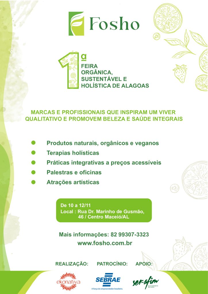Com uma temática de busca de qualidade de vida pautada em consumos mais saudáveis, naturais e orgânicos, a Feira Orgânica e Sustentável e Holística de Alagoas (Fosho/AL) realiza sua primeira edição em Maceió nos dias 10, 11 e 12 de novembro. O evento conta com a parceria do Sebrae/AL e acontecerá no espaço SebraeLab com uma programação de palestras, oficinas, comercialização de produtos sustentáveis e atendimentos terapêuticos holísticos com preços populares.