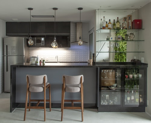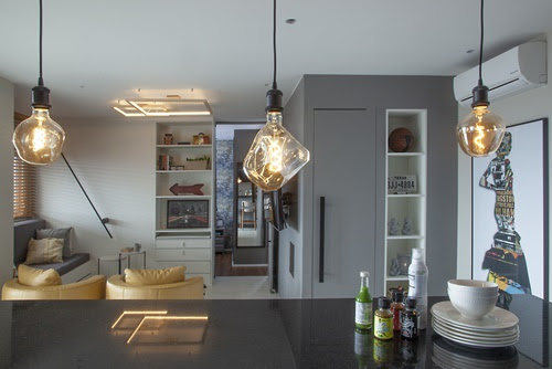Com o LED, a especialista investiu em um estilo arrojado para a luminária no teto e no visual embutido na marcenaria. Além da barra na parede, que também assume a função de apoio luminoso para os momentos de leitura no sofá, as lâmpadas pendentes em estilo industrial, dispostas em cima da bancada da cozinha, promovem aconchego e um toque de modernidade. | Foto: Luis Gomes