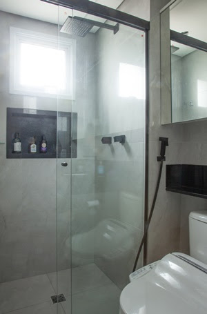 No banheiro do casal, a bancada de granito São Gabriel e a marcenaria foram mantidas, substituindo apenas os revestimentos e metais. A economia reverteu-se em benefício: ao evitar o quebra-quebra desnecessário, a bacia sanitária recebeu um assento com função de bidê.