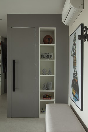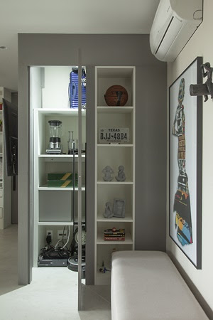 “Quem não sonha com uma despensa?”, indaga a arquiteta. Para ela, um imóvel pequeno não é um fator conflitante para proporcionar esse espaço para os moradores. Ao prolongar a parede onde foi instalada a televisão, por meio do sistema drywall, o projeto conquistou um pequeno espaço, com porta mimetizada, que permite guardar mantimentos, eletrodomésticos e até malas de viagem. “Um acesso muito discreto e valioso”, discorre.