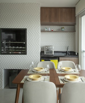 Conectada com a área social, a sala de jantar foi inserida na varanda dentro uma proposta plural, ressaltando a praticidade e a ideia do receber. De acordo com Cristiane Schiavoni, “a churrasqueira foi o ponto de partida para a execução do nosso projeto. O revestimento texturizado trouxe praticidade para a limpeza, tornando o espaço ideal para que o casal conviva com seus convidados”.