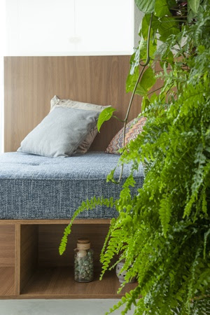 Fechando o dormitório, ao invés de uma parede, a marcenaria promove a separação e abre mais espaço de armazenamento | Foto: Luis Gomes