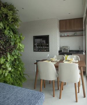 O paisagismo foi mais um dos pedidos do casal. Mas como incluir em um espaço pequeno? A resposta da arquiteta foi a realização de um jardim vertical preenchido por diversas plantas de espécie natural como a Peperomia variegata, Samambaia renda francesa e americana, Singônio e Lambari roxo, que tornaram o clima ainda mais aconchegante. “Nesse apartamento, aproveitamos a parede lateral da varanda e fizemos um sistema de irrigação automatizada, outro ponto que contribui com a praticidade nessa varanda gourmet” afirma.