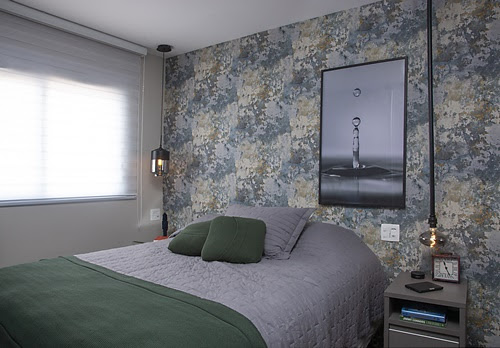 No décor, o papel aplicado na parede da cabeceira comandou todo o moodboard no décor do quarto, que conta com a suavidade do enxoval e das almofadas, bem como a leveza e a assimetria, representadas também pela luminária, permitindo sair do tradicional e espelhar o estilo do casal.