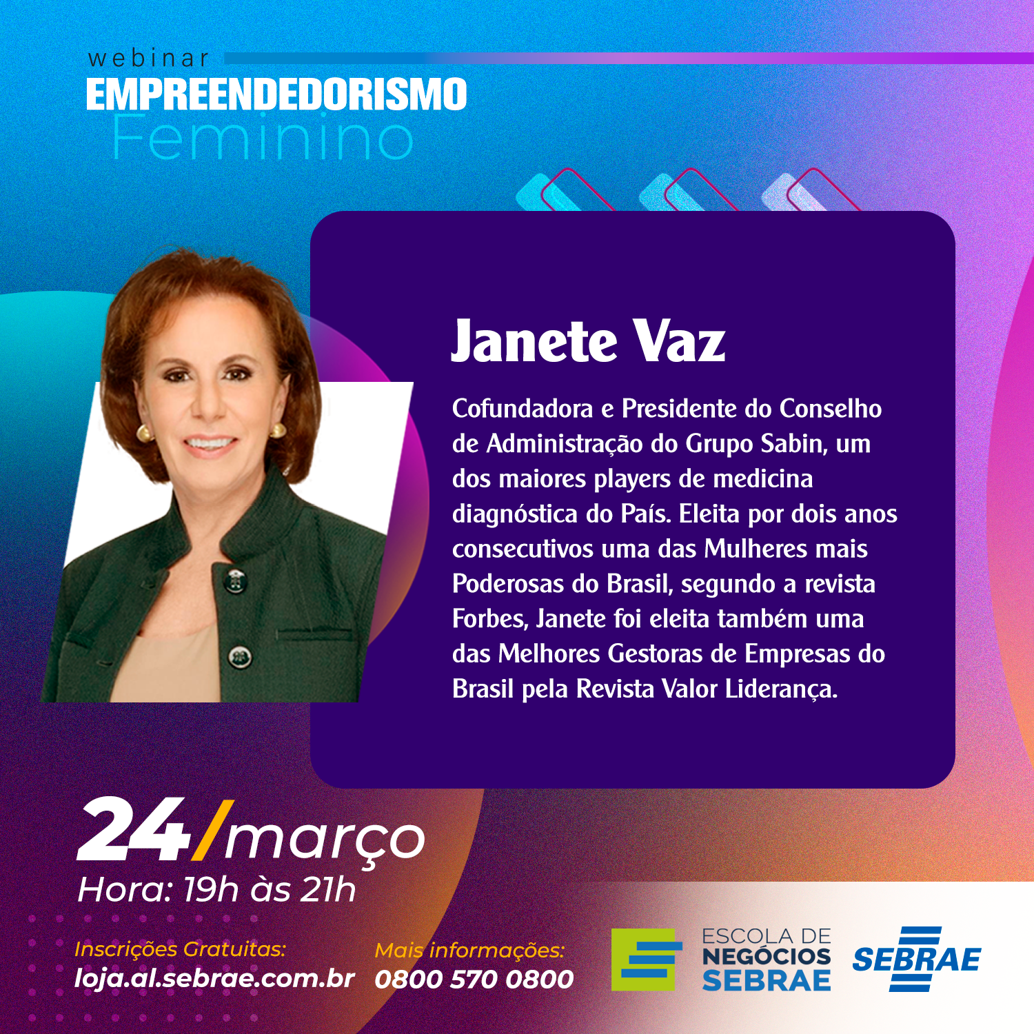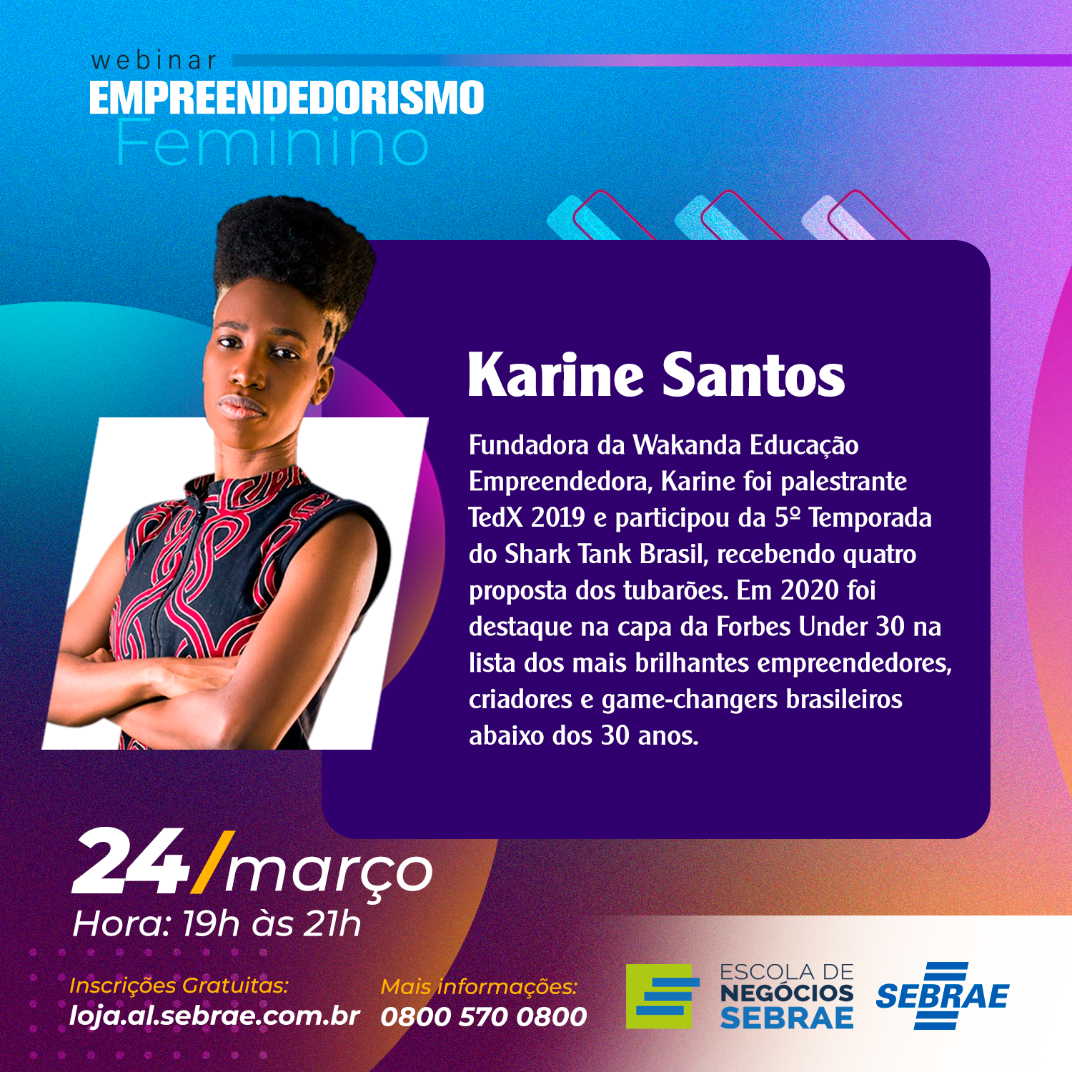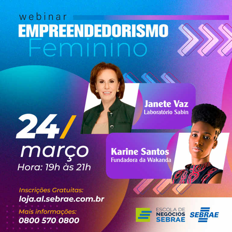 No seminário, as participantes poderão conhecer as histórias de Karine Santos, CEO e fundadora da Wakanda Educação Empreendedora, de Salvador/BA, e Janete Vaz, fundadora do Laboratório Sabin, de Anápolis/GO. Ambas irão compartilhar suas trajetórias de sucesso no mundo do empreendedorismo e falar como superaram os desafios para empreender e liderar o nascimento de seus negócios.
